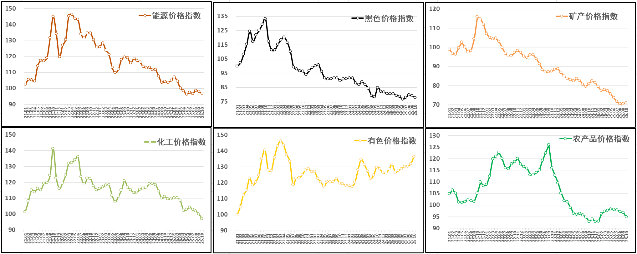 分行业看,有色价格指数继续走高,报136.4点,月环比上涨3.5%,年同比上涨5.2%;矿产价格指数止跌反弹,报70.9点,月环比上涨0.7%,年同比下跌12.5%;农产品(9.250, 0.84, 9.99%)价格指数小幅下行,报94.8点,月环比下跌2%,年同比上涨2.1%;能源价格指数继续走低,报96.8点,月环比下跌1.3%,年同比下跌7.3%;黑色价格指数延续弱势,报77.8点,月环比下跌1.5%,年同比下跌8.3%;化工价格指数加速下行,报96.9点,月环比下跌3.1%,年同比下跌12.7%。