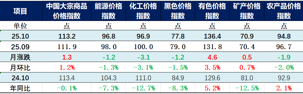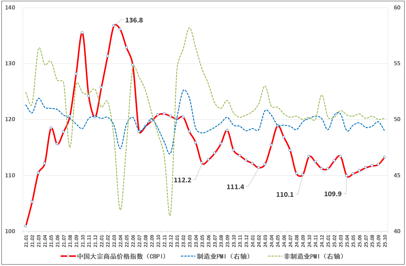新华财经北京11月5日电(记者 刘玉龙)5日,由中物联大宗商品流通分会和上海钢联(25.870, -0.30, -1.15%)等单位联合调查,中国物流与采购联合会发布的2025年10月份中国大宗商品价格指数(CBPI)为113.2点,环比上涨1.2%,同比下跌0.1%。从指数运行情况来看,指数连续六个月环比回升,且涨幅有所扩大,表明随着国家反内卷、稳增长等政策效能持续释放,高技术制造业、装备制造业和消费品行业继续保持快速增长,以及中美吉隆坡谈判释放积极信号,美联储再次降息等有利因素不断增多,企业信心进一步增强,大宗商品市场景气水平继续回升。