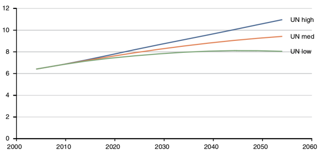 Ronald D. Sands, Carol A. Jones, and Elizabeth Marshall 农业到2050年:参考情景 全局参考情景提供了用于分析的比较点。然而,首先,了解参考情景中农业生产力随时间的变化的方式很重要。这开始于八种作物类型中的每一种的外生生产力指数,其随着时间增加(参见图5a)。这一指数被认为是增加土地:每单位产品需要更少的土地,但单位产品的其他投入的要求不受影响。在2005年至2005年期间,平均年增长率从0.93%到1.88% 2030.8从2030年到2050年,所有作物种群的增长速度都有所下降。 如果每个输入与产品单位的比率在每年中是固定的,则图5a将显示每种作物类型的产量。然而,所有投入与产品单位的比率对价格作出反应,以实现每种作物类型的需求和供应之间的平衡。特别是,如果作物价格相对于投入物(如化肥,土地,劳动力和资本设备)价格上涨,平衡产量将会增加。 图5a 增加农业生产力指数(2005 = 1)参考情景模型输入(外生67驱动程序) 小麦 稻米 粗粒 油籽 糖作物 水果和植物纤维 oth蔬菜注:这些生产力指数是2050年或2030年的生产率与2005年的生产率的比率(它们不是年增长率百分比)。 资料来源:美国农业部,经济研究服务部使用国际粮食政策研究所的数据。 随着时间的推移,在所有八个作物组中,FARM参考情景中作物类型的全球平均产量增加(图5b)。 在2005年至2030年期间,各种作物种群的年平均增长率在0.84%至2.18%之间。大部分增长是由于对作物生产力增长的假设(见图5a),但是一些增长是价格诱导。 FARM中的价格进行调整,使世界市场对所有作物都是清晰的(图6)。由于增加农业生产力的大幅增加,价格上涨幅度不大。 一般来说,如果图5b中的产量大于图5a中相应的土地增加生产率指数,作物价格随时间增加(图6)。9 对于每种农产品,需求等于全球一级的供应。 贸易允许区域一级的需求和供应差异: 出口+(人口×人均消费)=(收获面积×产量)+进口 图7a显示了在FARM参考情景中45年来五种主要作物的世界需求的增长。 每种作物的需求增加分为两个解释性因素:人口增长和收入增长。 作物需求的这些变化很大:从小麦的68%增加到糖的102%,五种作物类型的平均增加量为77%。 在这77%的增长中,50%归因于人口增长,其余27%归因于增加收入。 图5b 要作物群体世界平均产量指数(2005年= 1)参考情景模型输出(结合外生和内生效应) 小麦 稻米 粗粒 油籽 糖作物 水果和 植物纤维 oth 蔬菜 注:这些产量指数是2050年或2030年作物产量与2005年作物产量的比率(它们不是年增长率)。 资料来源:美国农业部,使用未来农业资源模型参考情景的经济研究服务。 图6主要作物的世界平均价格,参考情景 每公吨美元不变 来源:美国农业部,使用GTAP 7数据库的经济研究服务; 未来农业资源模型参考情景。 图7世界作物需求变化的组成部分(2004-49),参考情景 百万公吨 来源:美国农业部,使用GTAP 7数据库的经济研究服务; 未来农业资源模型参考情景。Valin et al。 (2014年)提供了粮农组织2010年10个全球经济模型中通过2050年的粮食需求比较,以及粮农组织对2050年的预测(Alexandratos和Bruinsma,2012年)。反刍动物肉,非转基因肉类,乳制品和直接消费的作物报告了以公吨计的食物需求。粮农组织使用2050年的收入预测,低于Ag MIP模型使用的收入预测,有助于对粮食需求的预测,通常低于Ag MIP平均水平。 随着时间的推移,粮食需求的差异主要反映人均粮食消费对收入增加的反应的不同功能形式和参数化,特别是对发展中国家。来自FARM模型的投影接近Ag MIP平均消费肉类和乳制品,但高于直接消费的作物的Ag MIP平均值。图7a报告了作物的总消费,包括间接用于肉类和乳制品的作物。 图7b提供了供应方对选择作物的产量和收获面积的分解.10在全球一级,需求的变化必须等于供应的相应变化。价格在FARM内调整,以实现每种商品的世界供求之间的平等。世界粮食供应的增长大部分是由于产量增加。在本参考方案中,每个作物的收获面积变化相对较小.11总收获面积的净变化略有负面。 图7b世界作物供应变化的组成部分(2004-49),参考情景 百万公吨 来源:美国农业部,使用GTAP 7数据库的经济研究服务; 未来农业资源模型参考情景。 如图8所示,土地利用参考情景模式的主要特征是,世界农田总数(五种作物加三种作物类型)随时间稳定,主要是因为对农业生产率增长的乐观假设(图5a)。 农田,牧场和林地的总量被限制为随时间恒定。12 在类似于根据参考情景构建的未来,在没有显着增加耕地面积或产品价格的情况下,可以满足与更大收入和更大人口相关的对农产品的增加的需求。 参考情景假设的农业生产率的增长足以满足对农产品的不断增长的需求。 然而,这一未来是不确定的,结果对用于构建参考情景的假设敏感。 图8世界农业土地利用模拟,参考情景 十亿公顷 *五大田间作物是水稻,小麦,粗粮,油籽和糖。 其他三种作物类型是水果和蔬菜,植物纤维和其他作物。 管理林是可进入的林地。 来源:美国农业部,使用GTAP 7数据库的经济研究服务; 未来农业资源模型参考情景。 人口 本节中的情景保持收入和生产率预测与参考情景相同,但允许人口遵循低路径或高路径。随着人口的增加,对农产品的需求几乎相同,即使没有增加人均收入。 2011年,联合国公布了2010年至2100年的世界人口预测(联合国,2011年)。不确定性的特点是使用对生育率的低,中和高假设。中等生育率情景下的