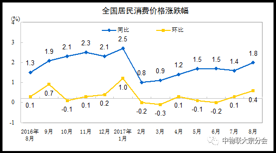 2017年8月份,全国居民消费价格同比上涨1.8%。其中,城市上涨1.9%,农村上涨1.5%;食品价格下降0.2%,非食品价格上涨2.3%;消费品价格上涨1.0%,服务价格上涨3.1%。1-8月平均,全国居民消费价格总水平比去年同期上涨1.5%。 8月份,全国居民消费价格环比上涨0.4%。其中,城市上涨0.4%,农村上涨0.5%;食品价格上涨1.2%,非食品价格上涨0.2%;消费品价格上涨0.5%,服务价格上涨0.2%。 一、各类商品及服务价格同比变动情况 8月份,食品烟酒价格同比上涨0.4%,影响CPI上涨约0.13个百分点。其中,鲜菜价格上涨9.7%,影响CPI上涨约0.22个百分点;蛋类价格上涨4.3%,影响CPI上涨约0.03个百分点;水产品价格上涨3.8%,影响CPI上涨约0.07个百分点;粮食价格上涨1.6%,影响CPI上涨约0.03个百分点;畜肉类价格下降8.4%,影响CPI下降约0.42个百分点(猪肉价格下降13.4%,影响CPI下降约0.39个百分点)。 8月份,其他七大类价格同比均有所上涨。其中,医疗保健、居住、教育文化和娱乐价格分别上涨5.9%、2.7%和2.5%,其他用品和服务价格上涨1.4%,衣着、生活用品及服务价格均上涨1.3%,交通和通信价格上涨0.7%。 二、各类商品及服务价格环比变动情况 8月份,食品烟酒价格环比上涨0.9%。其中,蛋类价格上涨13.5%,影响CPI上涨约0.07个百分点;鲜菜价格上涨8.5%,影响CPI上涨约0.20个百分点;畜肉类价格上涨0.7%,影响CPI上涨约0.03个百分点(猪肉价格上涨1.3%,影响CPI上涨约0.03个百分点);鲜果价格下降4.2%,影响CPI下降约0.07个百分点;水产品价格下降1.1%,影响CPI下降约0.02个百分点。 8月份,其他七大类价格环比五涨二降。其中,医疗保健、居住、交通和通信价格分别上涨0.7%、0.4%和0.3%,其他用品和服务、生活用品及服务价格分别上涨0.2%和0.1%;衣着、教育文化和娱乐价格分别下降0.2%和0.1%。