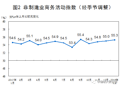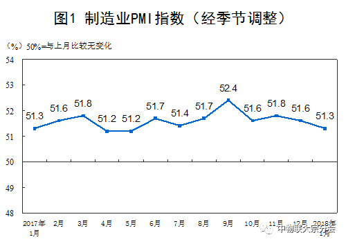一、中国制造业采购经理指数运行情况 2018年1月份,中国制造业采购经理指数(PMI)为51.3%,虽比上月回落0.3个百分点,仍与去年同期持平,制造业继续保持稳步扩张走势。 分企业规模看,大型企业PMI为52.6%,比上月回落0.4个百分点,继续在扩张区间内平稳运行;中型企业PMI为50.1%,比上月回落0.3个百分点,位于临界点之上;小型企业PMI为48.5%,比上月下降0.2个百分点,低于临界点。 从分类指数看,在构成制造业PMI的5个分类指数中,生产指数、新订单指数高于临界点,原材料库存指数、从业人员指数和供应商配送时间指数低于临界点。 生产指数为53.5%,虽比上月回落0.5个百分点,仍处于扩张区间,表明制造业生产保持稳定增长,增速有所放缓。 新订单指数为52.6%,比上月回落0.8个百分点,位于临界点之上,表明制造业市场需求扩张步伐有所放慢。 原材料库存指数为48.8%,比上月回升0.8个百分点,低于临界点,表明制造业主要原材料库存量降幅收窄。 从业人员指数为48.3%,比上月下降0.2个百分点,位于临界点以下,表明制造业企业用工量减少。 供应商配送时间指数为49.2%,比上月下降0.1个百分点,位于临界点以下,表明制造业原材料供应商交货时间放慢。 二、中国非制造业采购经理指数运行情况 2018年1月份,中国非制造业商务活动指数为55.3%,高于上月0.3个百分点,非制造业延续稳中有升的良好发展态势。 分行业看,服务业商务活动指数为54.4%,比上月上升1.0个百分点,服务业开局实现平稳较快增长。从行业大类看,零售业、航空运输业、电信广播电视和卫星传输服务、互联网软件信息技术服务、货币金融服务、保险业、租赁及商务服务业等行业商务活动指数位于55.0%以上的较高景气区间,业务总量较快增长。住宿业、餐饮业、房地产业、居民服务及修理业等行业商务活动指数位于临界点以下,业务总量有所回落。建筑业商务活动指数为60.5%,比上月回落3.4个百分点,建筑业企业生产活动放缓。 新订单指数为51.9%,比上月微落0.1个百分点,仍位于临界点之上,表明非制造业市场需求增速略有放缓。分行业看,服务业新订单指数为51.8%,比上月上升0.9个百分点,高于临界点。建筑业新订单指数为52.8%,比上月回落5.3个百分点。 投入品价格指数为53.9%,比上月回落0.9个百分点,继续高于临界点,表明非制造业企业用于经营活动的投入品价格总体水平继续上涨,但涨幅连续收窄。分行业看,服务业投入品价格指数为53.5%,比上月上升0.3个百分点。建筑业投入品价格指数为56.2%,比上月回落8.1个百分点。 销售价格指数为52.6%,与上月持平,继续位于临界点之上,表明非制造业销售价格总体水平保持上涨。分行业看,服务业销售价格指数为52.5%,比上月上升0.5个百分点。建筑业销售价格指数为53.3%,比上月回落2.3个百分点。 从业人员指数为49.4%,比上月微升0.1个百分点,低于临界点,表明非制造业从业人员数量虽有减少,但降幅继续收窄。分行业看,服务业从业人员指数为48.4%,比上月回升0.2个百分点。建筑业从业人员指数为55.4%,比上月回落0.5个百分点。 业务活动预期指数为61.7%,比上月上升0.8个百分点,连续9个月位于60.0%以上的高位景气区间。分行业看,服务业业务活动预期指数为61.2%,比上月上升0.9个百分点。建筑业业务活动预期指数为64.7%,比上月上升0.6个百分点。 三、中国综合PMI产出指数运行情况 2018年1月份,中国综合PMI产出指数为54.6%,与上月持平,表明我国企业生产经营活动总体继续保持平稳较快的发展态势。 附注 1.主要指标解释 采购经理指数(PMI),是通过对企业采购经理的月度调查结果统计汇总、编制而成的指数,它涵盖了企业采购、生产、流通等各个环节,包括制造业和非制造业领域,是国际上通用的监测宏观经济走势的先行性指数之一,具有较强的预测、预警作用。综合PMI产出指数是PMI指标体系中反映当期全行业(制造业和非制造业)产出变化情况的综合指数。PMI通常以50%作为经济强弱的分界点,PMI高于50%时,反映经济总体扩张;低于50%,则反映经济总体收缩。 2.调查范围 涉及《国民经济行业分类》(GB/T4754-2011)中制造业的31个行业大类,3000家调查样本;非制造业的31个行业大类,4000家调查样本。 3.调查方法 采购经理调查采用PPS(Probability Proportional to Size)抽样方法,以制造业或非制造业行业大类为层,行业样本量按其增加值占全部制造业或非制造业增加值的比重分配,层内样本使用与企业主营业务收入成比例的概率抽取。 本调查由国家统计局直属调查队具体组织实施,利用国家统计联网直报系统对企业采购经理进行月度问卷调查。 4.计算方法 (1)分类指数的计算方法。制造业采购经理调查指标体系包括生产、新订单、新出口订单、在手订单、产成品库存、采购量、进口、主要原材料购进价格、出厂价格、原材料库存、从业人员、供应商配送时间、生产经营活动预期等13个分类指数。非制造业采购经理调查指标体系包括商务活动、新订单、新出口订单、在手订单、存货、投入品价格、销售价格、从业人员、供应商配送时间、业务活动预期等10个分类指数。分类指数采用扩散指数计算方法,即正向回答的企业个数百分比加上回答不变的百分比的一半。由于非制造业没有合成指数,国际上通常用商务活动指数反映非制造业经济发展的总体变化情况。 (2)制造业PMI指数的计算方法。制造业PMI是由5个扩散指数(分类