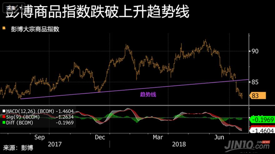 昨日,大宗商品经历了一场暴跌,许多人以为大跌之后会有反弹,且技术指标已经进入超卖区域。但是,这几张图表告诉你,大宗商品的崩盘可能才刚刚开始。 昨日,受美元大幅攀升以及市场紧张情绪推动,大宗商品集体重挫,进入调整区域。伦敦铜一度跌破6000美元关口;伦敦锌、伦敦镍、伦敦锡分别跌4.8%、3%和2%;现货钯金跌超3%至788美元/盎司,创2008年12月来新低。 由于市场越来越担心贸易战可能会破坏全球经济增长,从而抑制从铝到大豆等各种商品的需求,彭博商品指数从5月份的高点下跌了约10%。即使是传统的避险金属黄金也未能避免下跌,因为随着美联储加息预期的提升,投资者们更青睐美元。 铜经常被视为全球经济增长的晴雨表。7月2日,铜的14天相对强度指数跌破30,交易员将这视为铜价反弹的迹象。但是,事与愿违,铜价非但没有涨,本月还下跌了约9%。而且铜价的RSI于7月11日下降到19.6,为2015年以来的最低水平,此后一直保持在30以下。 金属商品的下跌令彭博商品指数进入了超卖区间,渥太华贸易中心北美研究主管加里·克里斯蒂(Gary Christie)表示,虽然通常资产价格在达到超卖水平后会反弹,但这次的情况可能会有所不同。 克里斯蒂还指出,7月11日该指数跌破上升趋势线,加剧了投资者的抛售行为,跌势越来越猛烈。技术指标MACD也显现了下跌信号,看跌趋势正在增强。虽然所有金属都处于超卖区域,但看不到复苏的迹象,市场似乎对MACD发出的信号没有分歧。 根据美国商品期货交易委员会(CFTC)的数据,截至7月10日当周,基金经理对Comex铜的看跌押注数量超过了他们的看涨押注,这是自2016年10月以来的首次。 荷兰国际集团(ING Bank NV)大宗商品策略师诺金特(Oliver Nugent)周三在一份报告中表示,由于各基金开始结束看涨押注,并增加新的看跌押注,广泛应用于电网、管道、电线、汽车和电子产品的红色金属价格已从今年6月初的高点下跌。诺金特称,虽然看跌赌注增加可能会在空头回补时刺激价格短期反弹,但价格很可能“在整个季度基本保持低迷”。 除金属外,农产品也是大宗商品抛售中遭受打击最严重的产品之一。美国农业部7月12日在全球作物月度预测中说,美中贸易紧张可能使明年大豆库存比一个月前的预期高出51%。不过,石油和铁矿石似乎是例外。 沙特周四表态称不会让超过需求的石油进入市场,这有利于稳定油价。而且由于需求强劲和消费季节性增加,该国的库存将在下半年下降。此外,因中国通过抑制工业活动加强了对污染的控制,原材料价格可能会飙升至每吨100美元,据Mysteel.com说,含铁量为65%的优质矿石每个月都在上涨,本周的交易价格超过每吨91美元。