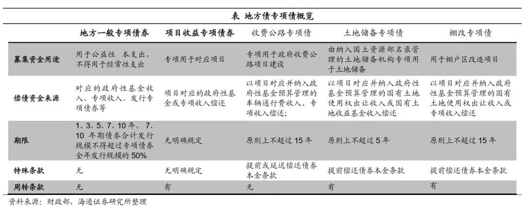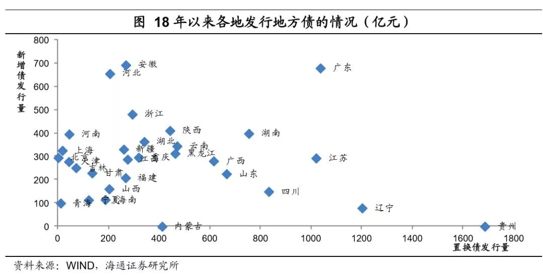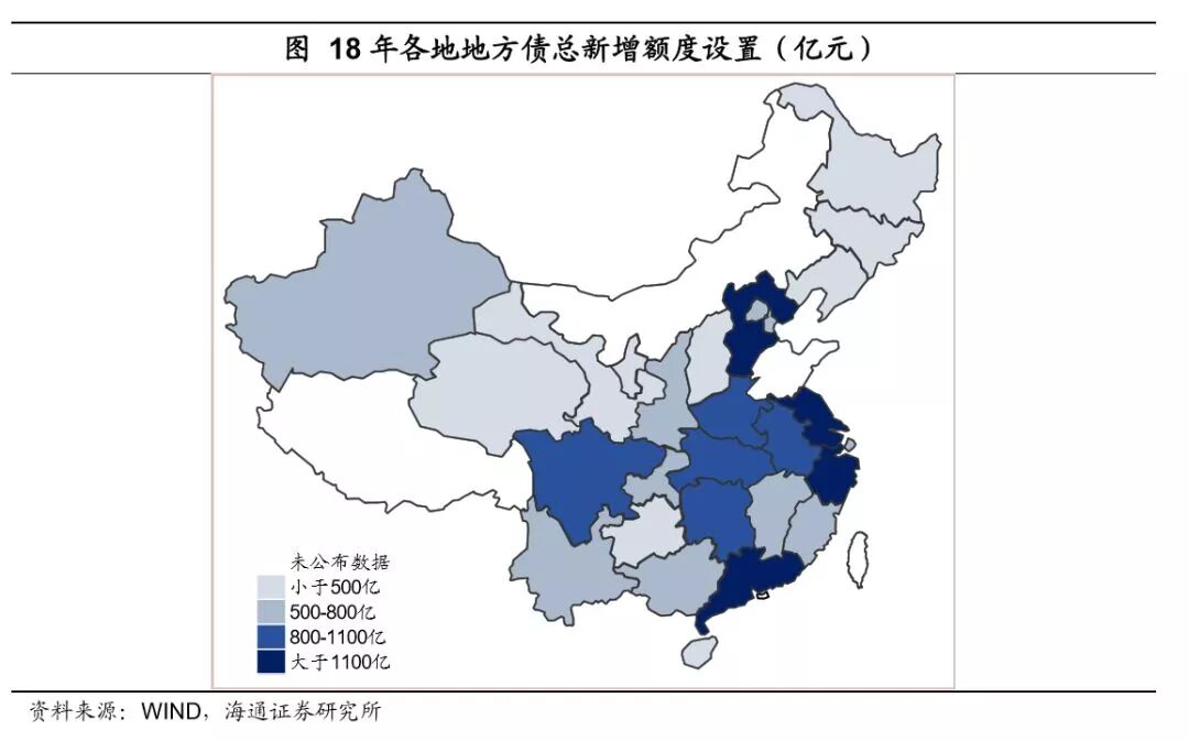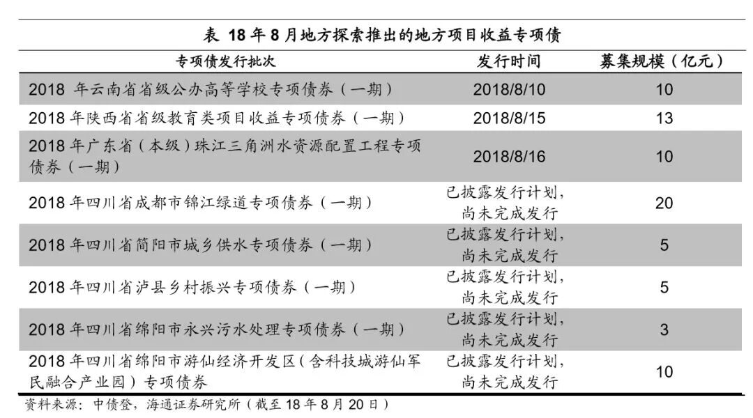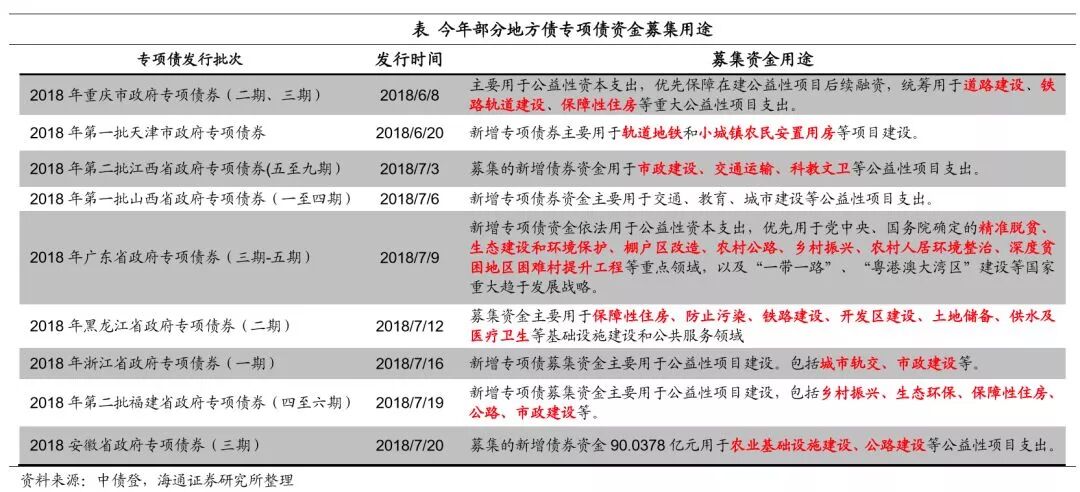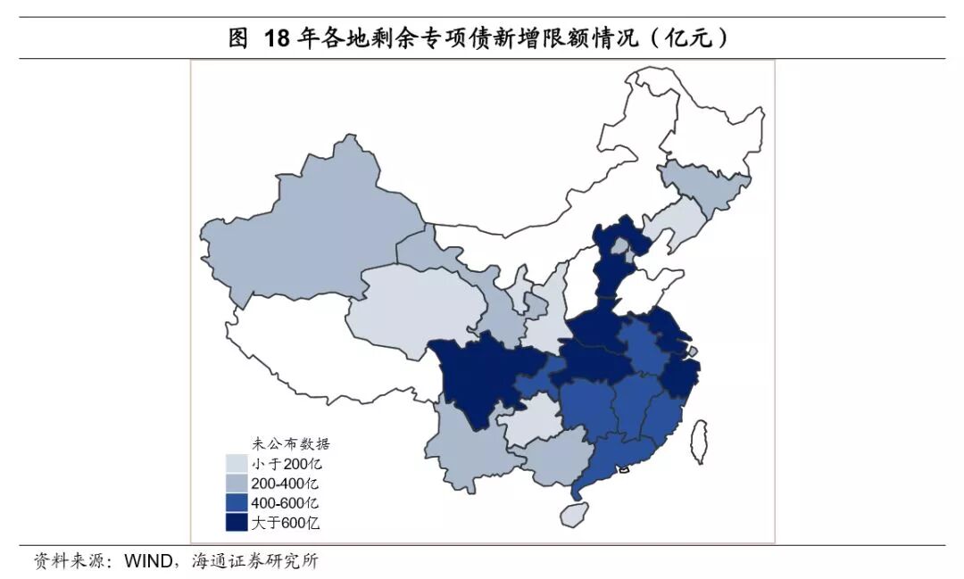 主要观点: 年内尚有超万亿专项债新增额度。上半年地方债更侧重于推进债务置换,新增债发行较少。1-7月地方置换债(包括再融资券)累计发行有1.37万亿,到7月底非地方债券形式的地方政府债务预计只剩下0.5万亿左右,年内债务置换将继续推进,但置换压力较上半年已有明显减少。而新增债从5月始启动,截至7月底合计发行仅0.8万亿左右。特别是新增专项债,年初以来累计发行量仅有1500亿左右。今年专项债新增额度安排了1.35万亿,现有额度下新增专项债还有1.2万亿的发行量空间。新增专项债将转为年内地方债发行工作重心,且8-10月将是集中发行期。近日财政部要求加快地方专项债券发行和使用进度,新增专项债发行量在3季度原则上要完成全年80%,剩余额度主要放在10月份发行。截至8月20日,8月各地已经发行出来的新增专项债规模已有1610亿,还有1410亿披露了发行文件,近日将完成发行,合计已超3000亿。 专项债将主要补充基建资金来源。1)存量地方债投向:存量地方政府债务投向中,市政建设、交运、土储和保障性住房债务占比较高,多数省份这几项的占比能达到60%-70%。2)专项债将主要补充基建投资资金。具体到地方专项债,其资金纳入政府性基金预算管理,对应的支出主要涉及交通设施、水利设施、城市维护、公共事业发展、移民和社会保障、生态环境建设7大类支出,除了土地出让金相关支出中的拆迁补偿外大部分都属于基础设施建设支出。3)专项债募集资金具体投向:地方专项债又可分为专项债和项目收益专项债,后者需直接对应项目资产和收益,是前者的细化品种,新增专项债和项目收益专项债发行量之比2017年大概是2:1,今年项目收益专项债的比重预计还会增加。募集资金投向看,专项债募集资金多用于市政建设、交通运输、保障性住房建设安居工程等基础设施建设领域,也用于乡村振兴、扶贫和生态环保等三大攻坚战有关项目;项目收益专项债则分为土地储备、收费公路、棚改、轨交、教育类等多个细分品种,且在不断创新中。 年内地方债剩余额度都在哪些地区? 高债务省份以置换债为主,新增债额度较少。我国基建投资需求区域分化,东部地区城镇化率高、基建投资增速较低,中西部地区基础设施薄弱、建设需求高。但是一个地区基建投资需求量大、增长快,并不意味着它有较大的融资空间。靠举债支撑的基建投资往往形成巨额债务,地方债务风险也就越大。出于控制风险的目标,像贵州、辽宁、宁夏、海南、青海这些地方政府负债率高的地区,每年新增的债务限额都非常少,2018年这5个省份地方债务总额新增限额均在300亿以下,而像江苏、广东、浙江等地区新增额度都在千亿以上。从今年各地地方债发行情况看,新增债发行较多的省份有广东、安徽、河北、浙江等中、东部地区,而贵州、辽宁省则是置换债发行量最大的两个省份。 中部地区剩余新增专项债额度较多。目前有25个省份披露地方债新增限额详细数据,江苏省今年新增专项债额度最多,目前剩余额度远高于其他各省份,占全部剩余额度的11.6%左右。除此之外,中部省份包括湖北、河北、河南、安徽等地区剩余额度也较高,4省合计剩余额度占全国的21%左右。而西部省份除了四川省外新增专项债额度普遍偏少,比如云南、广西今年只有318亿、314亿新增专项债额度,新疆、甘肃都只有200多亿,贵州和宁夏虽然没有公布详细数据,但去年两个地区新增专项债额度分别只有8亿和13亿。 7月31日政治局会议定调实施积极的财政政策和稳健的货币政策,称财政政策要在扩大内需和结构调整上发挥更大作用。联系7月23日国务院常务会议表态积极财政政策要更加积极,下半年将加快专项债发行推动基础设施建设,不难看到地方专项债将在财政政策发力中发挥重要作用。 1、今年以来地方债发行侧重债务置换 上半年地方债更侧重于推进债务置换,新增债发行较少。从地方债募集资金用途看,今年1-7月地方债发行的主要是置换债,累计发行有超过1.37万亿,而新增债从5月份才开始陆续发行出来,6月和7月发行量逐渐上来,分别有3157亿和4614亿,合计仅0.8万亿左右。可见此前地方债发行工作中,更侧重于推进债务置换进程,而新增债券发行相对较少。 特别是新增专项债,年初以来累计发行量仅千亿。从年初给一般债和专项债的额度来看,地方一般债新增额度安排8300亿,专项债1.35万亿。但从年初以来的发行情况看,1-7月地方新增一般债累计发行了6639亿,新增专项债只有1485亿。 2、债务置换继续推进,专项债将大幅放量 置换债不直接带来新增融资。上半年地方债以债务置换为发力点,而债务置换并不能带来直接的新增融资。比如发行地方债置换了城投的一笔债务后,平台公司原本计划用于偿还该笔债务的融资就可以释放出来,进行投资或补充流动性,这种情况下债务置换可以间接增加整个体系的融资量;但如果地方债置换的城投债务后,城投平台因免除了该笔债务而减少了融资计划,这种情况下债务置换就仅仅是替换的一个概念,不增加整个体系的融资量。考虑到今年上半年城投公司融资环境偏紧,后一种情况出现的概率增加,因而上半年置换债的大量发行对新增融资贡献并不等量。 年内地方债置换继续推进,隐性债务化解方法尚待定论。随着债务置换的推进,截至18年7月末地方非政府债券形式存量政府债务余额只有5094亿,